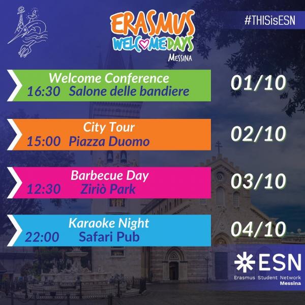 Nel primo weekend del mese di ottobre si e tenuta la welcome week, che ha visto i soci e le nuove reclute di ESN Messina impegnarsi per dare il benvenuto ai nuovi studenti erasmus arrivati in citta. Nella prima giornata si e svolta la conferenza di benvenuto, tenutasi presso il Salone delle bandiere del Municipio. Il giorno seguente si e svolto il city tour: i soci e le reclute si sono improvvisati guide turistiche per un giorno per descrivere i monumenti piu belli e rappresentativi della citta. Il terzo giorno e stato organizzato un barbecue presso lo Zirio, per far assaporare alcuni prodotti tipici locali agli erasmus immersi nella natura dei colli peloritani. I welcome days si sono chiusi, infine, con un divertente karaoke tenutosi presso il Safari pub!